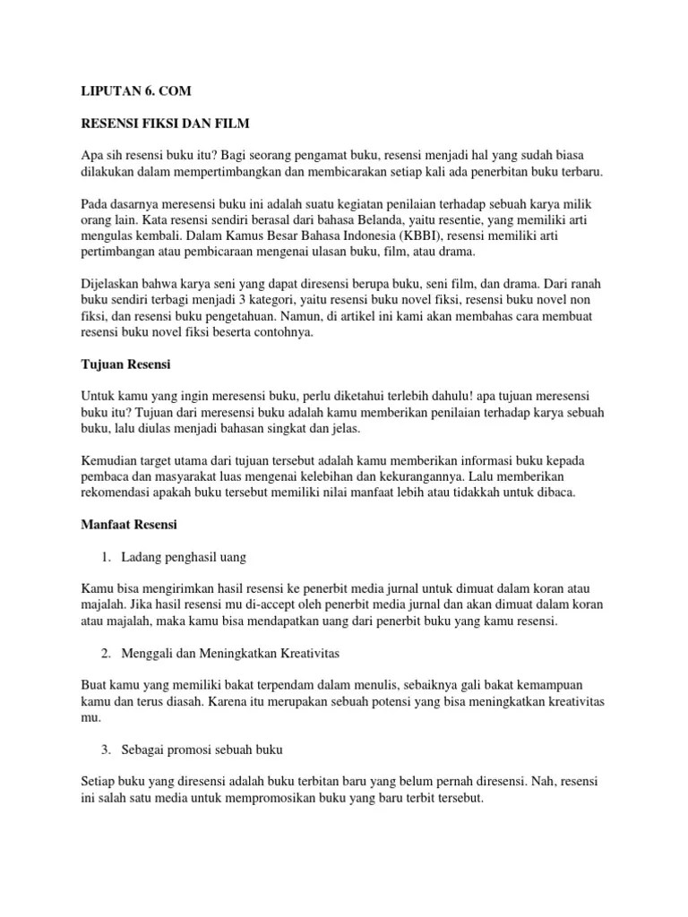Sebenarnya enggak cuma kitab saja yang dapat diresensikan, quipperian tapi dapat juga berupa karya seni film dan drama. Bisa berupa buku, film, drama, dan sebagainya. Sinopsis merupakan ringkasan cerita dengan mengutamakan alur atau plot yang tepat dan menarik dari suatu cerpen, novel, atau drama. Hasil proses meresensi buku itu disebut resensi buku. Dadan sutisna hujan ngecrek ti beurang kénéh.